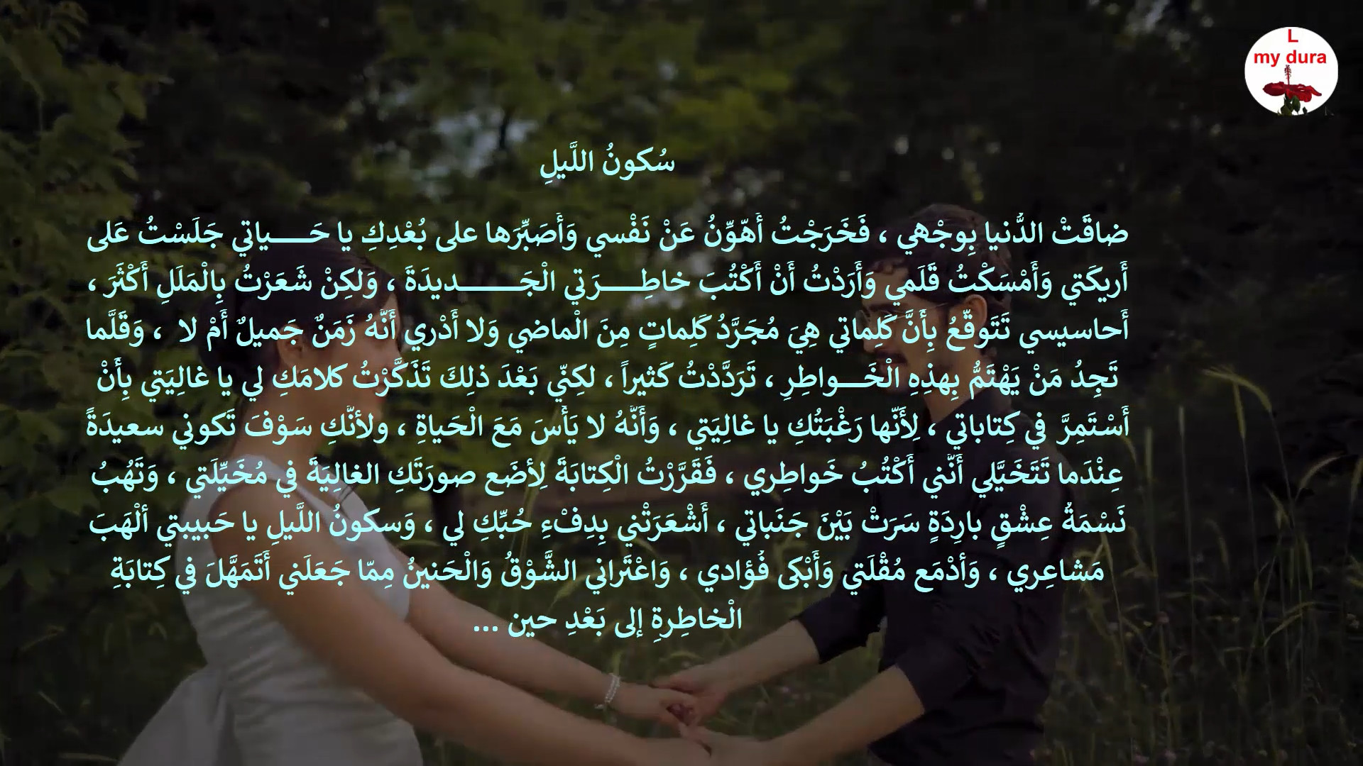 سَرَتْ بَيْنَ جَنَباتي ، أَشْعَرَتْني بِدِفْءِ حُبِّكِ لي ، وَسكونُ اللَّيلِ يا حَبيبتي ألْهَبَ مَشاعِري ، وَأدْمَع مُقْلَتي وَأَبْكى فُؤادي ،